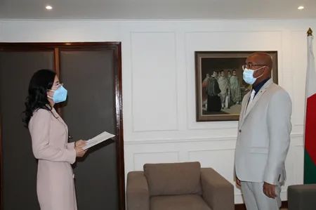 11月10日,中国新任驻马达加斯加大使郭晓梅向马外长贾科巴递交国书副本。