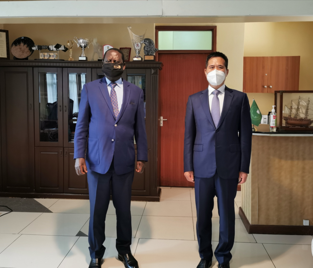 11月10日,驻肯尼亚大使周平剑拜会肯前总理、非盟基础设施发展高级代表奥廷加。